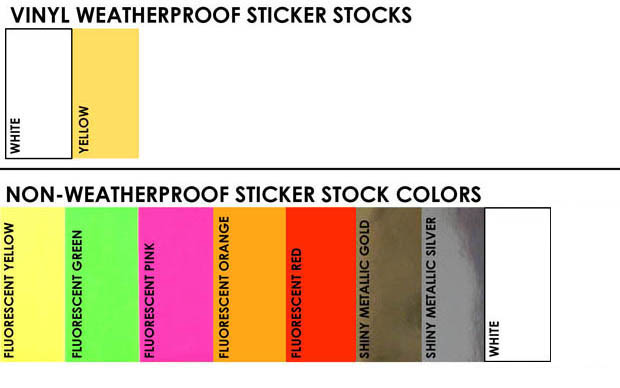 We offer both Weatherproof Vinyl and Non-weatherproof Paper sticker stocks. See the approximate colors, below.