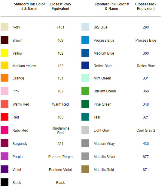 A Note on Standard Ink Colors: The closest PMS match is listed for each standard color for reference. PMS matches for standard colors are approximate and may vary. We cannot guarantee a perfect match to the listed PMS color.