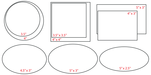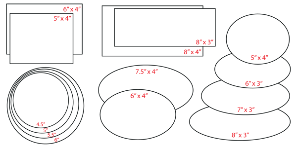 OVALS: 5″ X 4″, 6″ X 3″, 7″ X 3″, 8″ X 3″, 6″ X 4″, 7½” X 4″