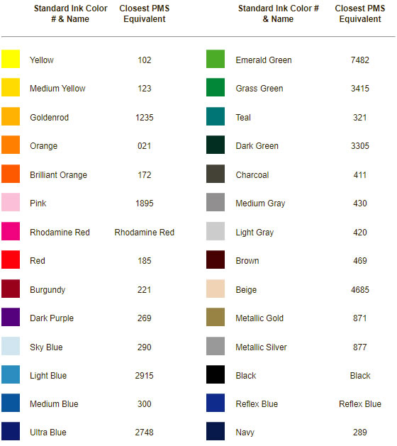 STANDARD INK COLORS are listed at the bottom of this page. If you require a specific Pantone color, a $45 charge will apply, for each ink match. IMPORTANT: WHITE INK counts as an additional color, when printing on CLEAR VINYL.